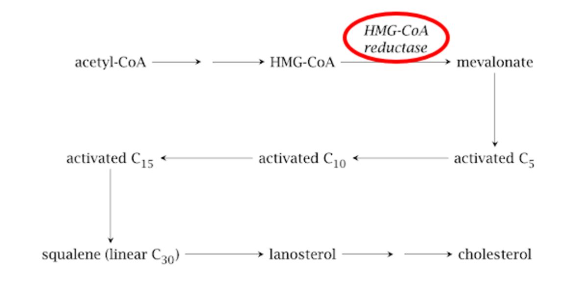 Figura VII. Representação gráfica da rota da síntese do colesterol no organismo a partir do acetil-CoA. Sinaliza a enzima inibida pelo propionato.