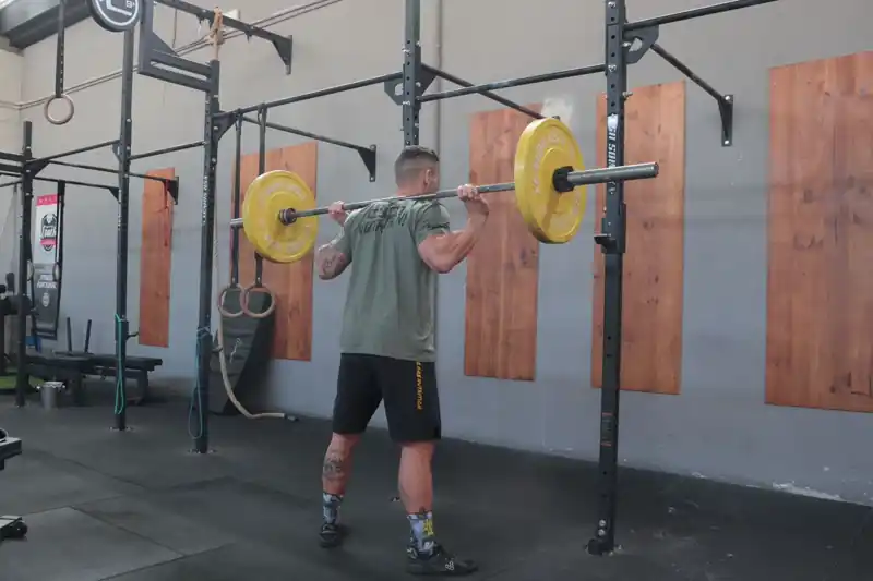 - Coloca a barra sobre os trapézios (não no pescoço) e segura com uma pega ligeiramente mais larga que os ombros. Mantém os cotovelos apontados para o chão para evitar tensão nos pulsos.