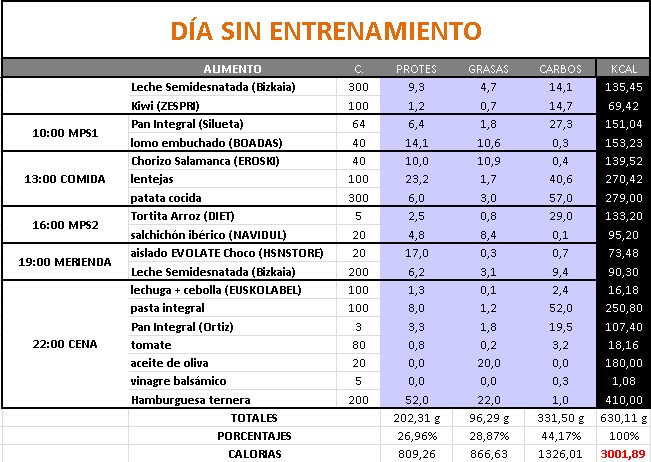 Como podem ver, a quantidade de calorias varia de um dia de treino para um dia de descanso, e também variam as percentagens de macronutrientes, “metendo” algo mais de carbohidratos nos dias de treino do que nos de descanso.