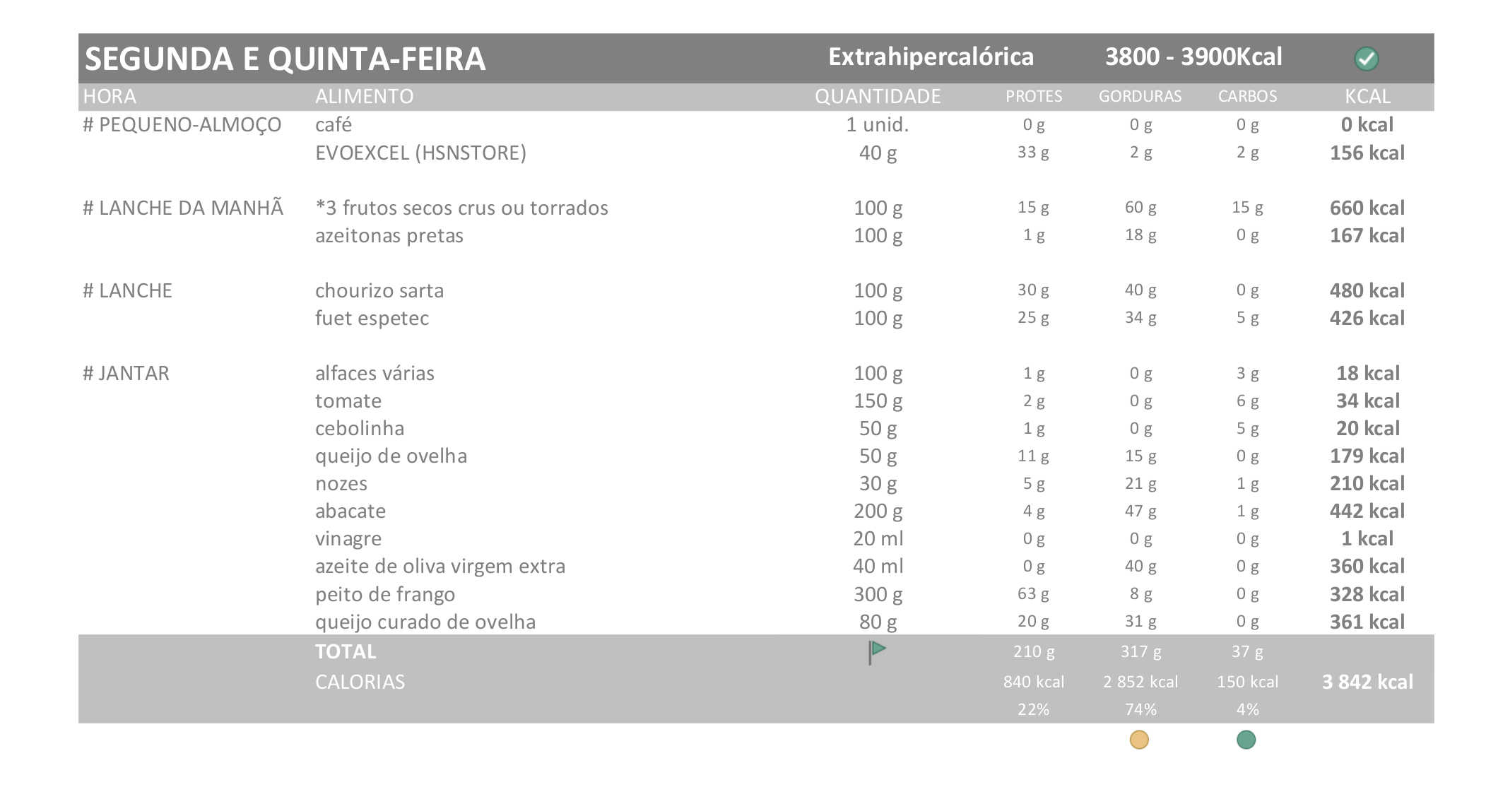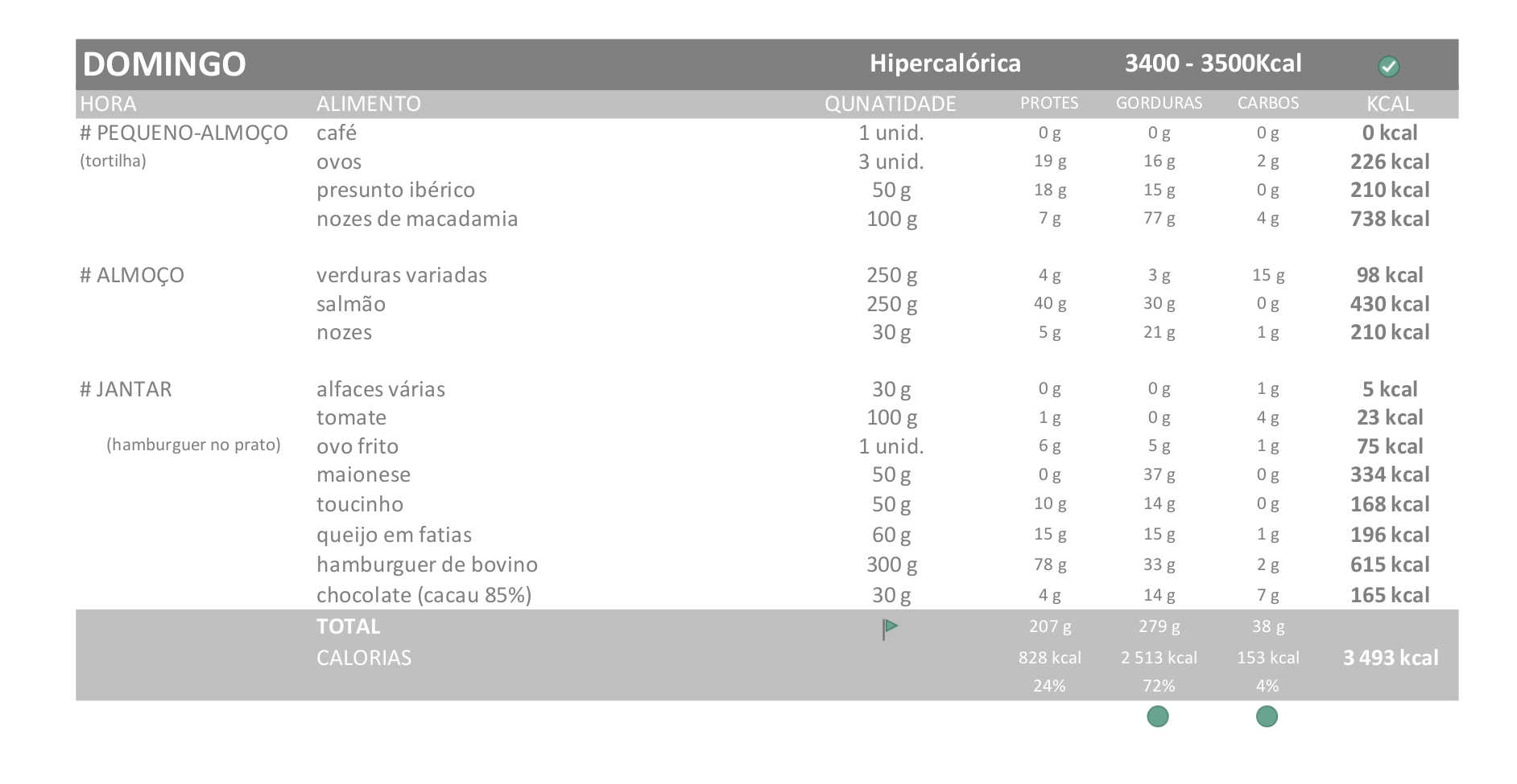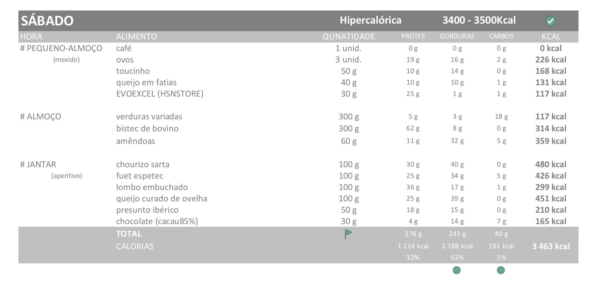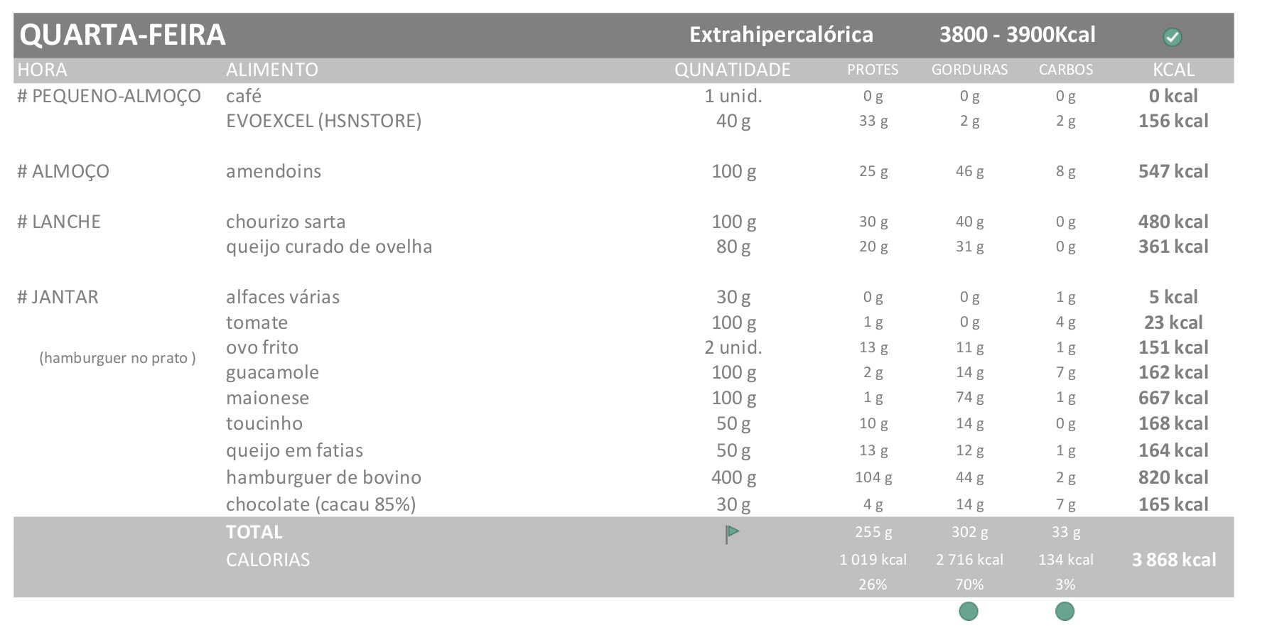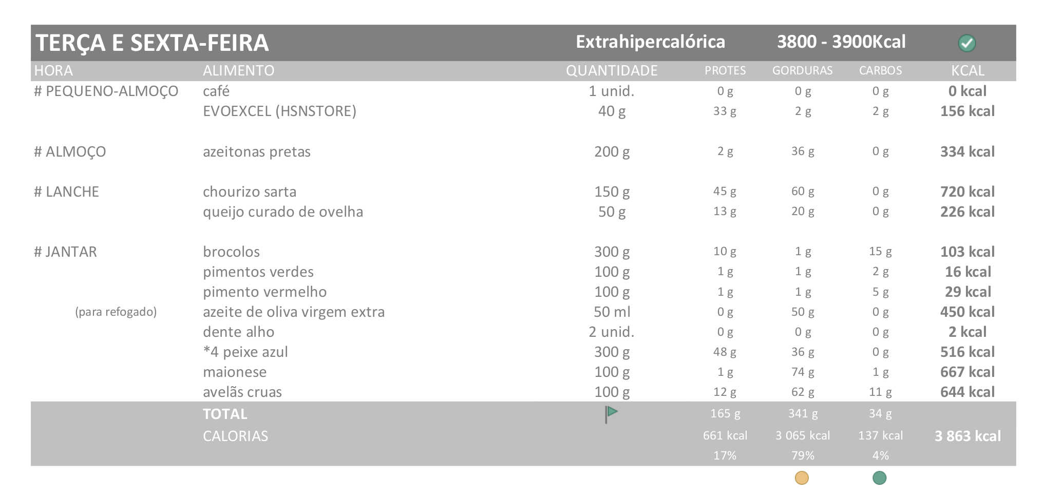 Esta é a dieta que vou seguir esta semana, com os ajustes que comentei na valoração (dieta extrahipercalórica):