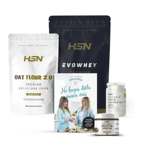 Pack that includes Instant Oat Flour, Evowhey Protein 2 Kg, Organic Coconut Fat 400 g, and Low Sugar Cocoa and Hazelnut Cream 350 g.