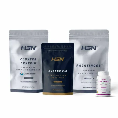 Sports pack that combines Evordx 2.0 (500 g), Palatinose powder (3 Kg), Cluster Dextrin (2 Kg) and natural caffeine capsules, designed to prepare drinks during training.