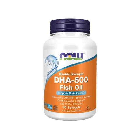 DHA-500 by Now Foods is a softgel food supplement based on fish oil concentrate (EPA and DHA).