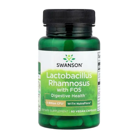 Lactobacillus Rhamnosus with FOS 5 Billion CFU from Swanson is a food supplement made with Lactobacillus Rhamnosus and fructooligosaccharides (FOS) in vegetable capsules.