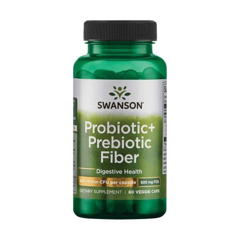 Probiotic + Prebiotic fiber 500 Million CFU from Swanson is a dietary supplement in vegetable capsules made from a bacterial ferment and short-chain fructooligosaccharides.