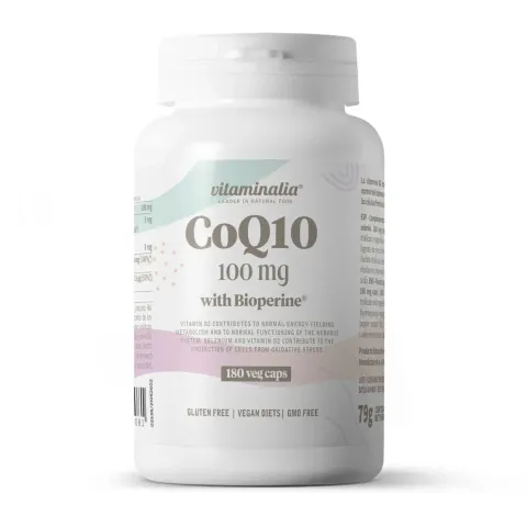CoQ10 + Bioperine® by Vitaminalia is a food supplement in vegan capsules, based on Ubiquinone (Coenzyme Q10) and Bioperine® black pepper extract standardised to 100% piperine. The formula has been enriched with riboflavin and selenium.