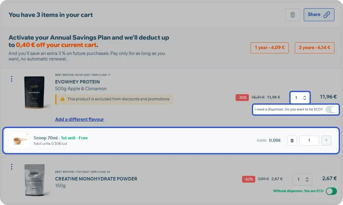 For example, as you can see in the image, you've added a 500g bag of Evowhey Protein to your shopping cart, which requires a 70ml scoop. You've also added a 150g bag of Evofuel to your order, selecting the option for a scoop (which has the same dimensions as the one for Evowhey Protein). The first scoop is free, while the second one costs €0.50. The recommended serving size for Evowhey Protein and Evofuel is 70ml.