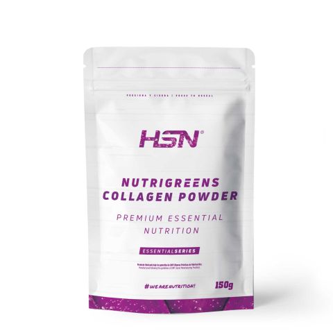 Complete Nutrigreens + Colagénio da EssentialSeries é um suplemento alimentar em pó à base de colagénio hidrolisado, frutas e legumes concentrados, com vitamina C, extratos de plantas, enzimas e probiótico.
