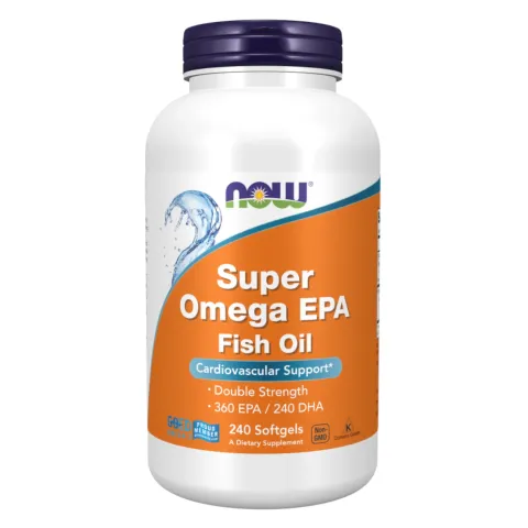 Super Ómega EPA 1000 mg da Now Foods é um suplemento alimentar à base de óleo de peixe em pérolas.