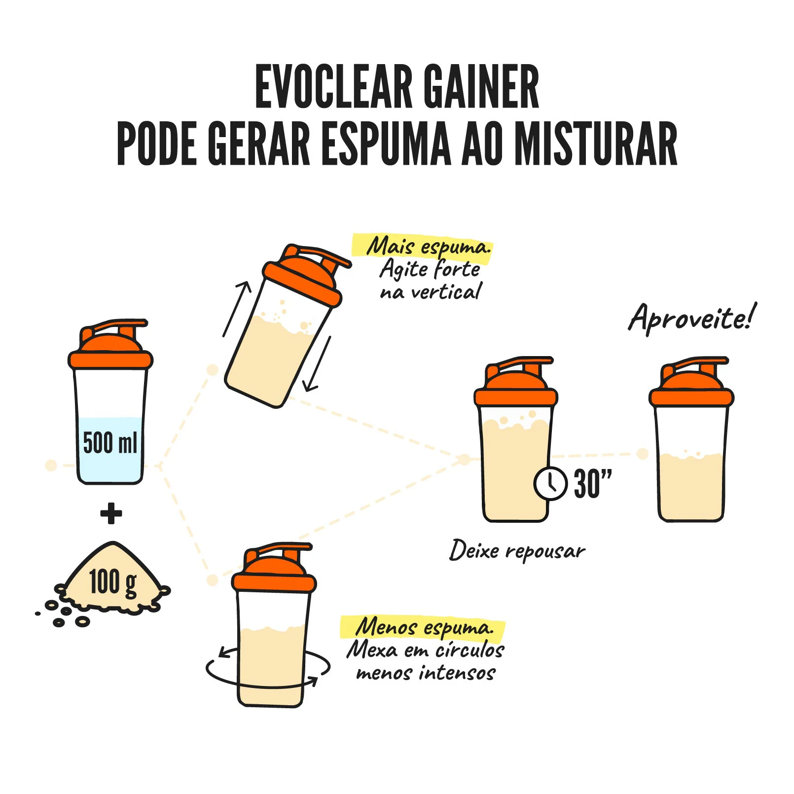 Evoclear Gainer pode gerar espuma se agitares vigorosamente num shaker, pois a interação entre a proteína e os hidratos de carbono promove que fique ar preso.