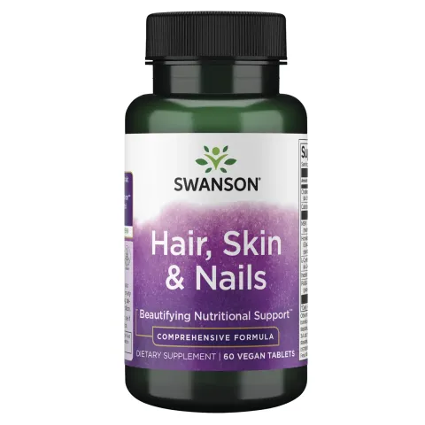 Pelo, pele & unhas da Swanson é um suplemento alimentar em comprimidos que contém ingredientes como colina, MSM, cavalinha, L-cisteína, inositol e ácido para-aminobenzoico.