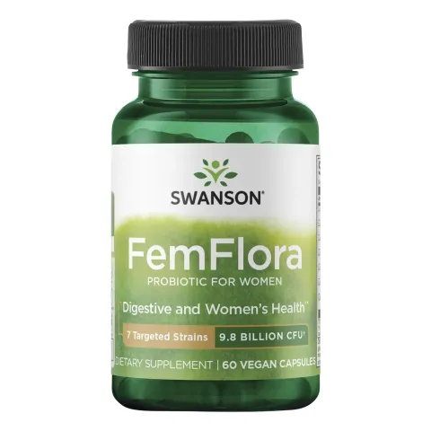 Femflora Probiotic Para Mulheres 9,8 Billion CFU da Swanson é um suplemento alimentar elaborado com 7 estirpes de Lactobacilos em cápsulas vegetais.