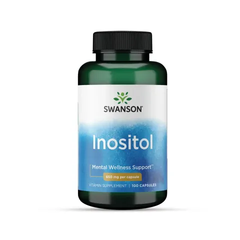 Inositol 650mg da Swanson é um suplemento alimentar em cápsulas elaborado à base de inositol.