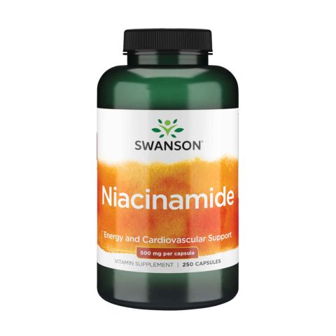 Niacinamida 500mg da Swanson é um suplemento alimentar elaborado com niacina (vitamina B3) em cápsulas de alta concentação.