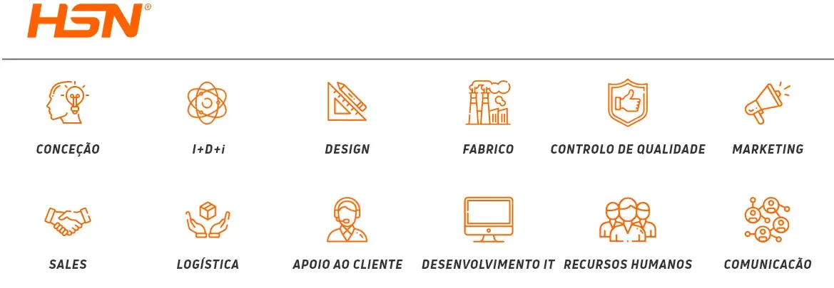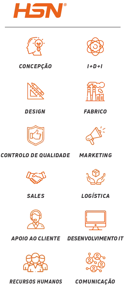 Na HSN fazemos tudo: Conceção, Desenvolvimento, Design, Fabrico, Controlo de Qualidade, Marketing, Vendas, Logística, Apoio ao Cliente e Desenvolvimento de IT.
